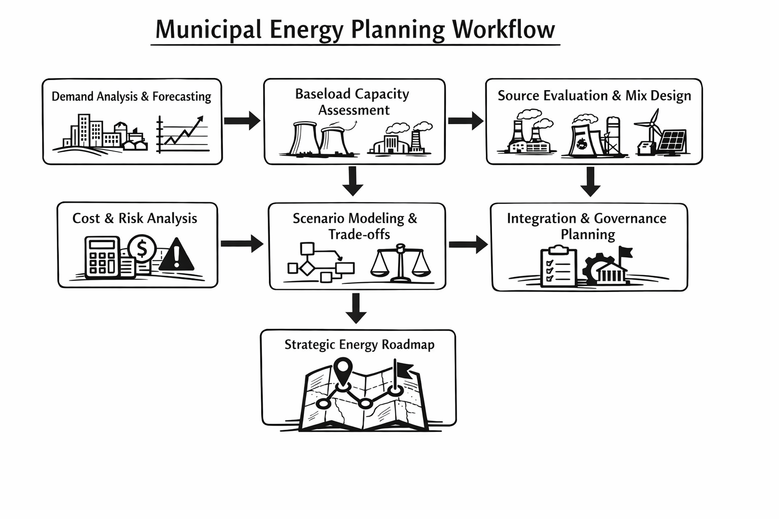 Effective regional energy planning follows a structured, decision-first workflow. The diagram below outlines how Engedi approaches municipal energy strategy from demand analysis through long-term roadmap development.